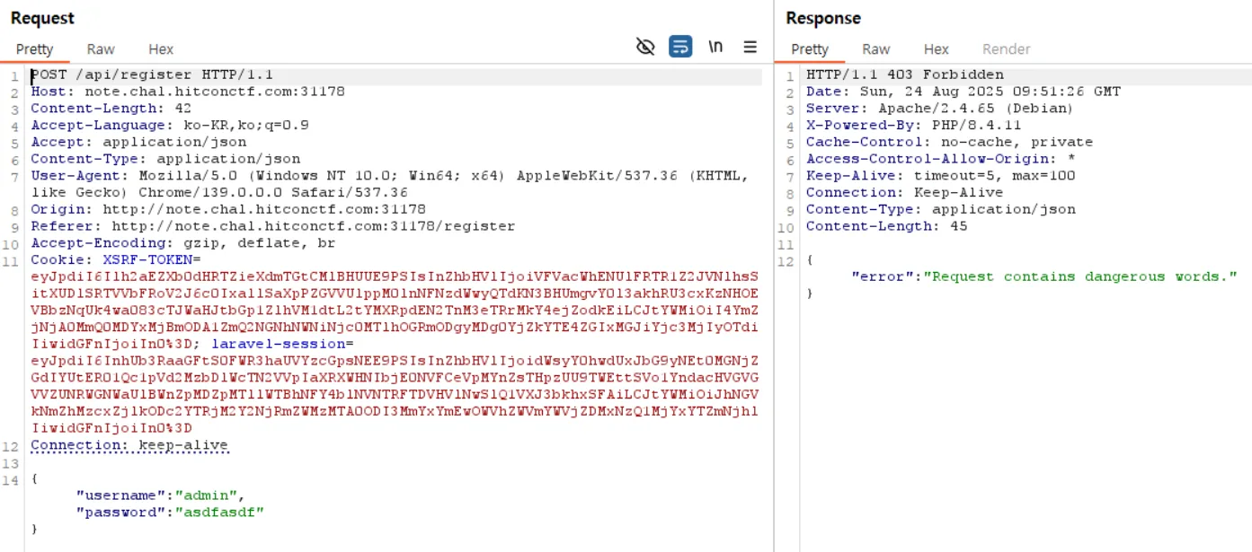 several routes pass through a middleware called DangerousWordFilter, which blocks requests if the raw body contains the substrings .. or admin