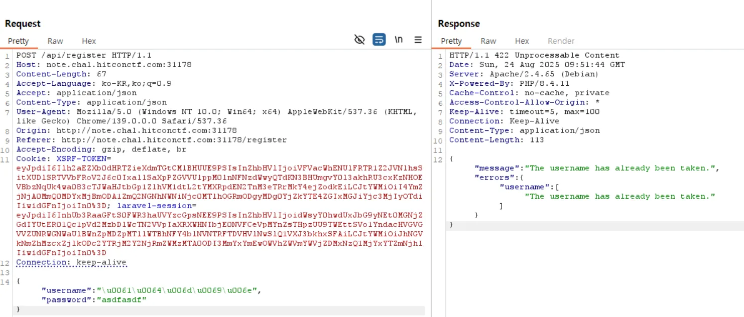 i also tried a unicode-encoded bypass; as shown above, the DangerousWordFilter can be circumvented, but the account can’t be created because the username already exists. given that, the remaining path is to trigger XSS via the report() method and leak the admin bot’s session