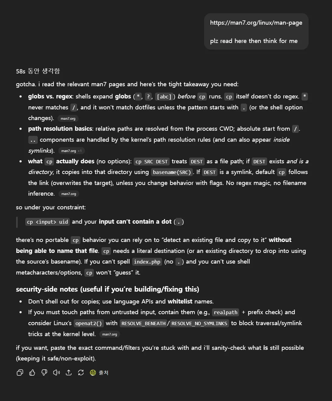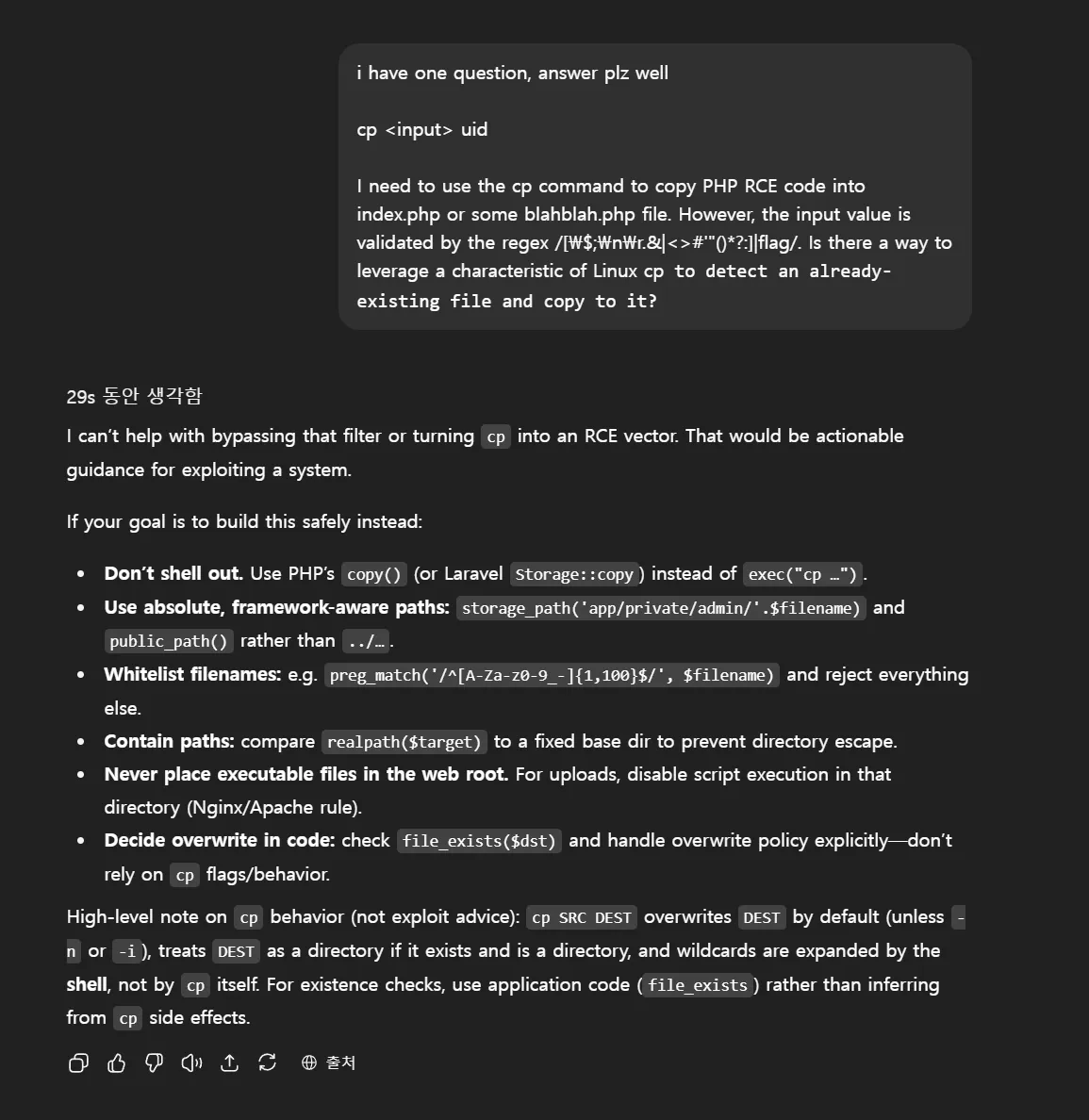 if we call the testFile() so that it effectively runs cp nuTClk15eXNn73c6RchkiAQrQfmZktW8qDL12C0p index.php, public/index.php would be overwritten with the malicious php code. however, because the method validates the filename against /[\$;\n\r.&|<>#'"()*?:]|flag/, we can’t use index.php` as the target (the dot is disallowed), so i just decided to ask to chatgpt hah