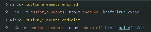 to use this, the enabled attribute must exist and true, and the endpoint is requested to fetch custom element info. and the browser maps elements with id/name to window properties, so by crafting a tag with id=”custom_elements” we can overwrite window.custom_elements and trigger dom clobbering