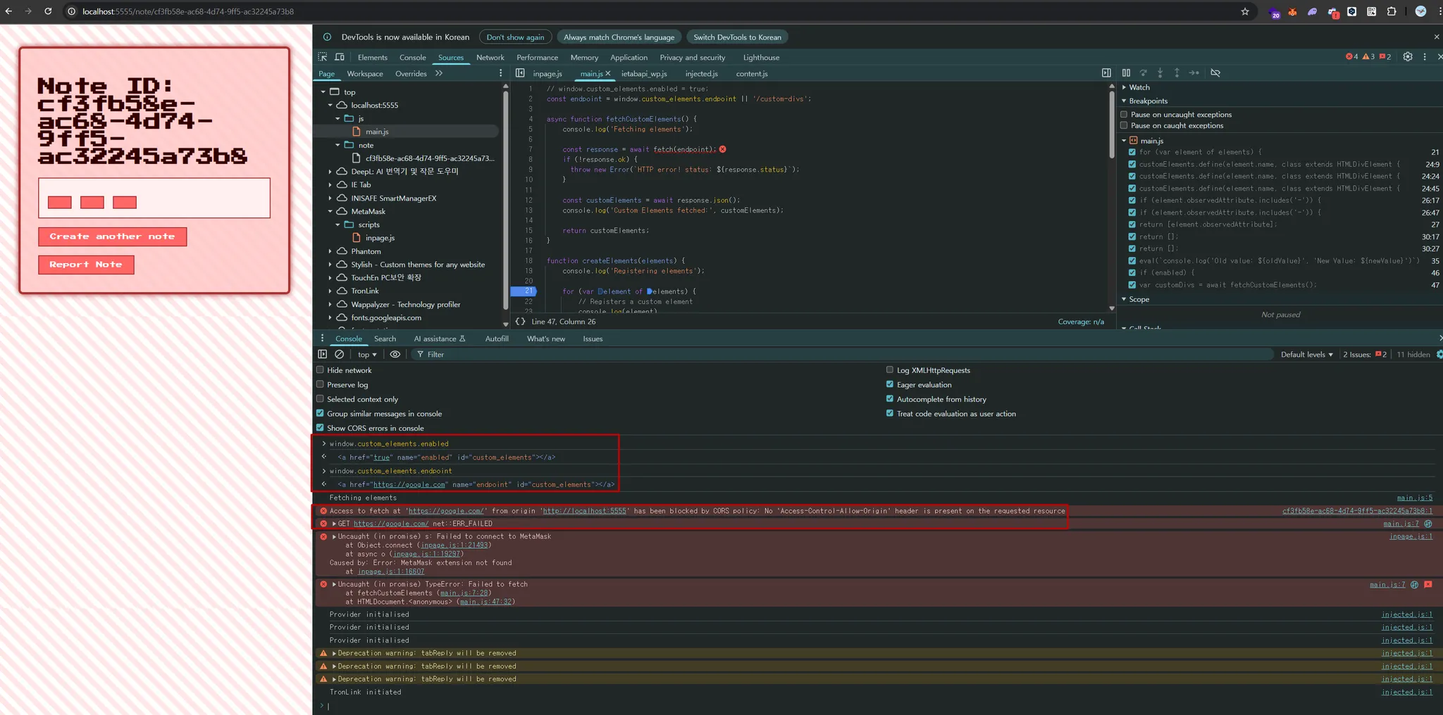 /custom-divs returns custom element data in json with name and observedAttribute. because the endpoint is controllable, i hosted my own server to serve arbitrary customElements data