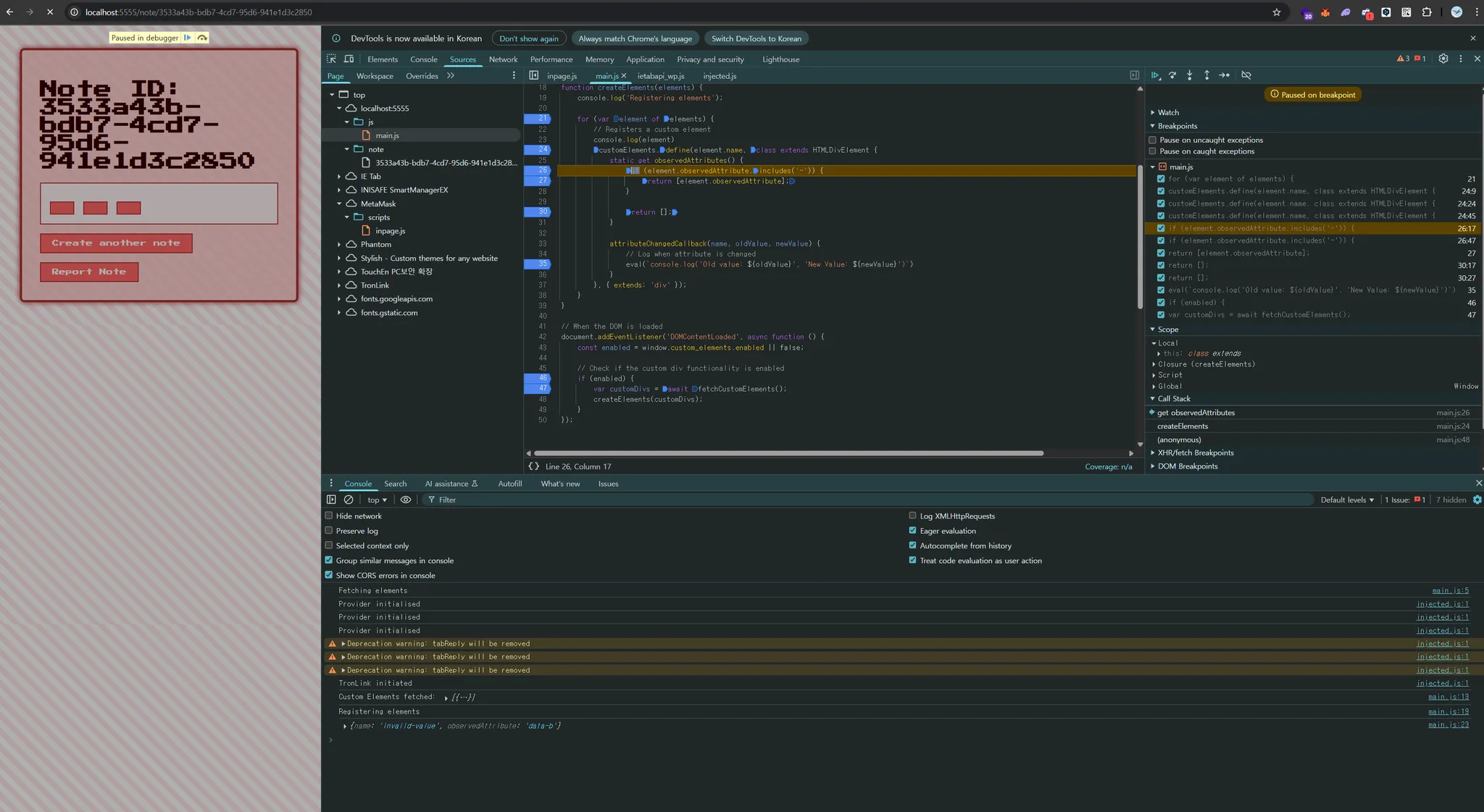 however, i realized that if we pass an array with the first value as the title attribute and the second value as just a hyphen (-), we could bypass the restriction without using a custom attribute. when i opened the code in the browser, the attributeChangedCallback() function was indeed executed and printed to the console
