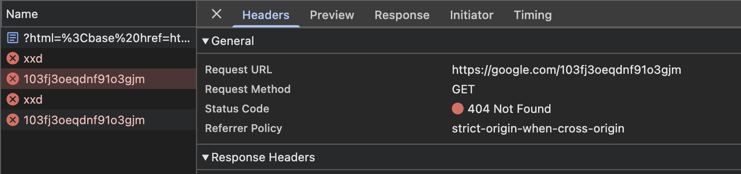 when visting the page, it is expected that the <base> tag will not be applied due to the csp. however, when actually visiting the link, it seems that before the csp is enforced, the tags are loaded and a request is being sent to google.com